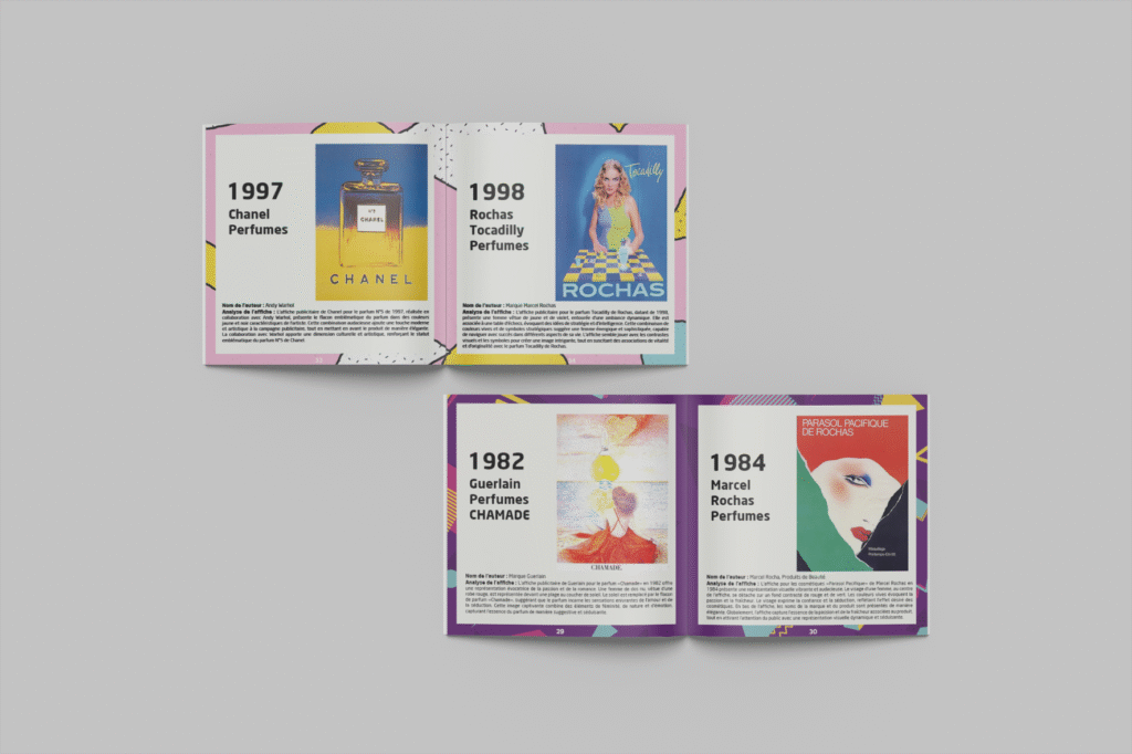 J’ai conçu et réalisé un livret retraçant un siècle d’affiches publicitaires de parfums. Ce projet m’a permis d’explorer l’évolution des tendances graphiques, typographiques et visuelles à travers différentes époques, tout en travaillant sur la mise en page éditoriale et la hiérarchisation des contenus.