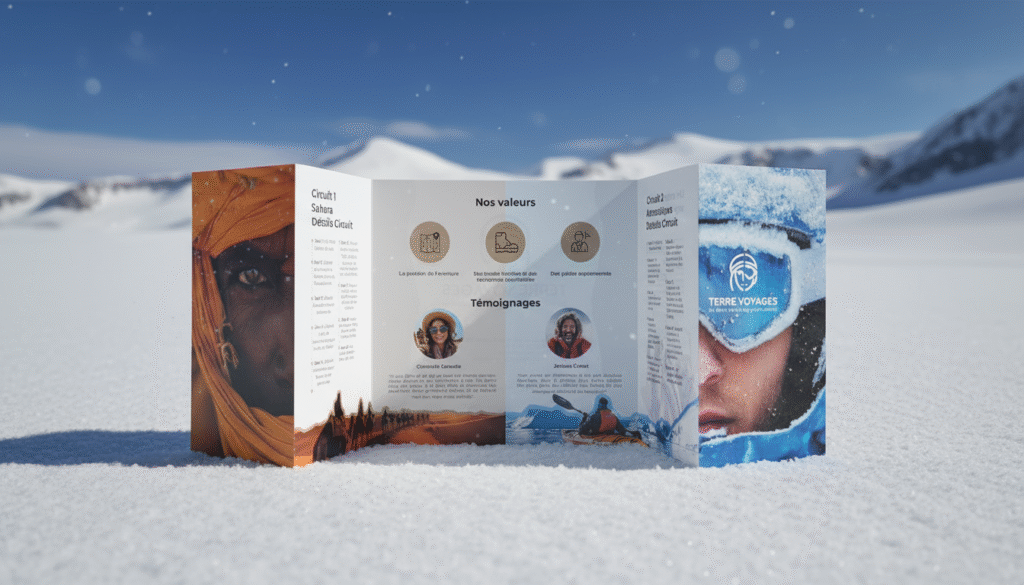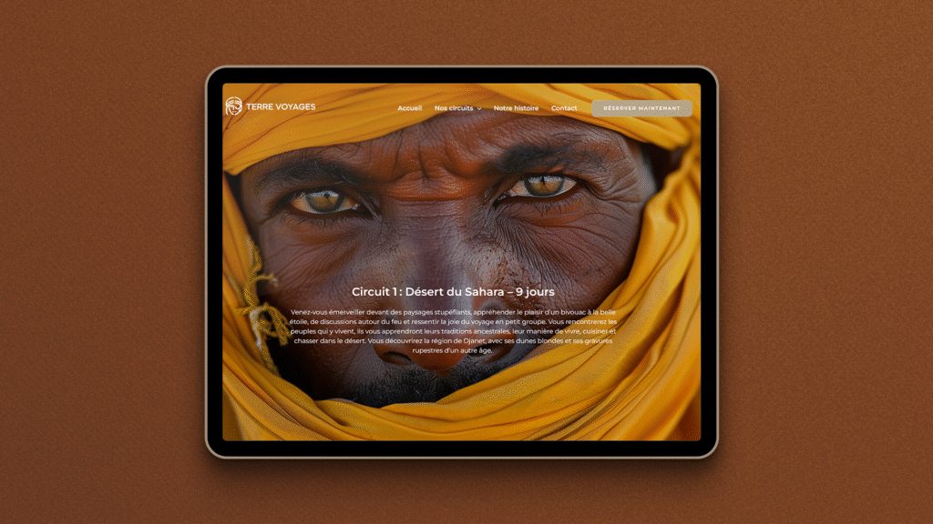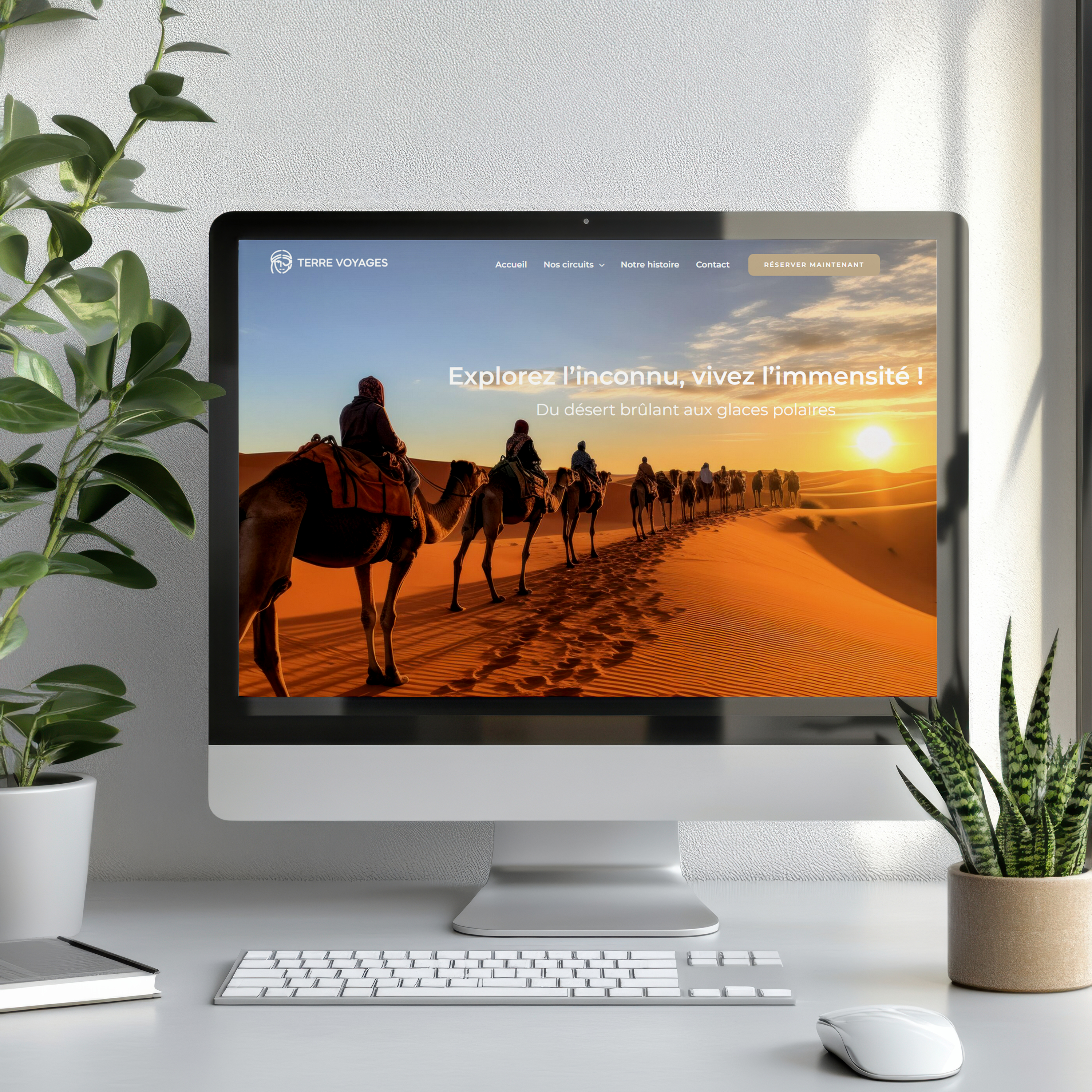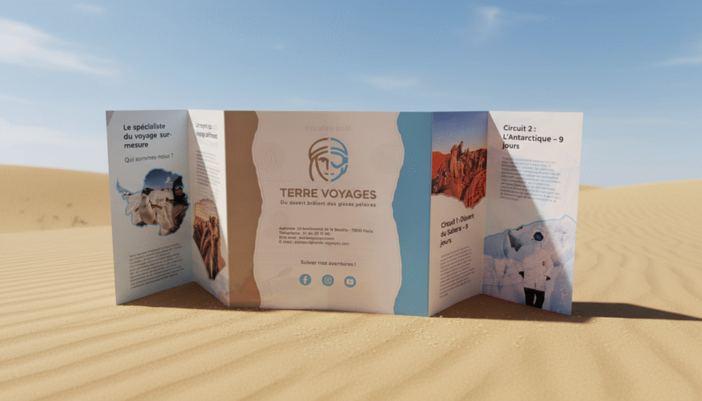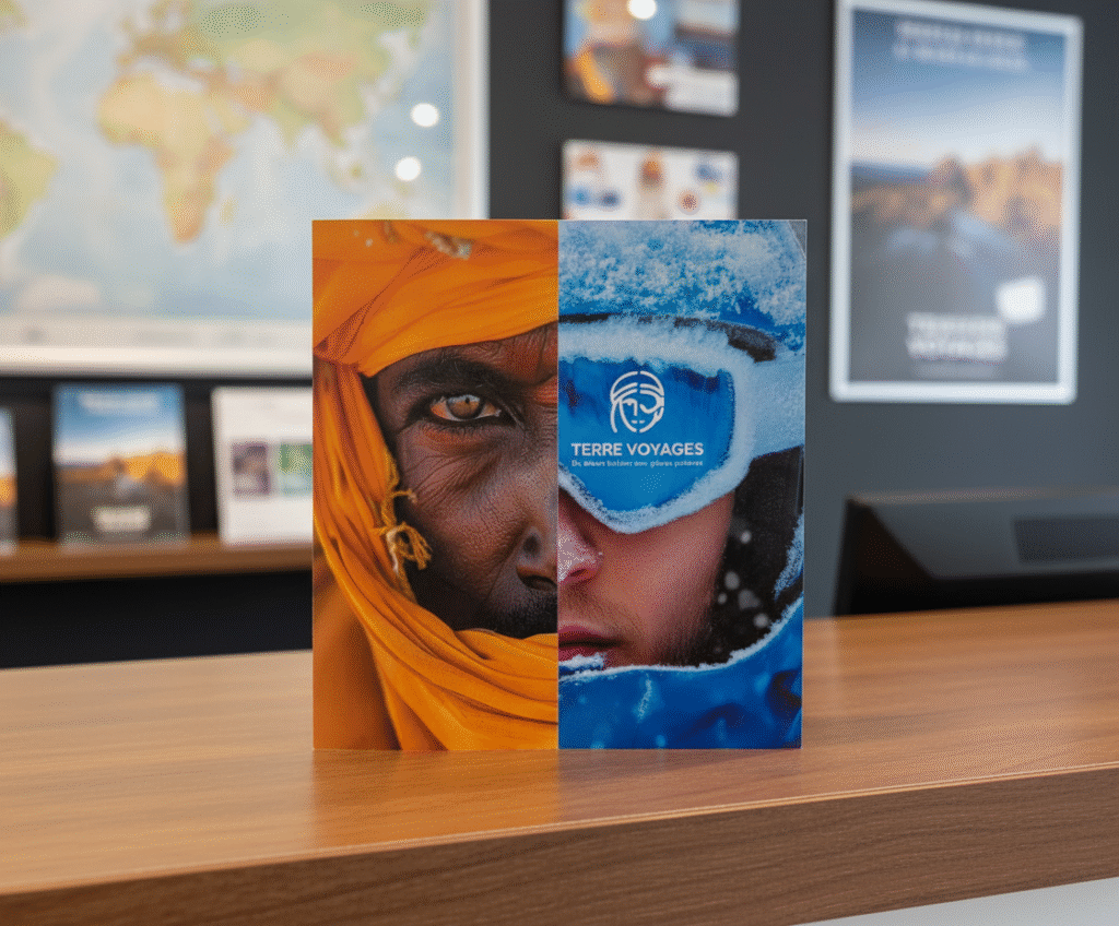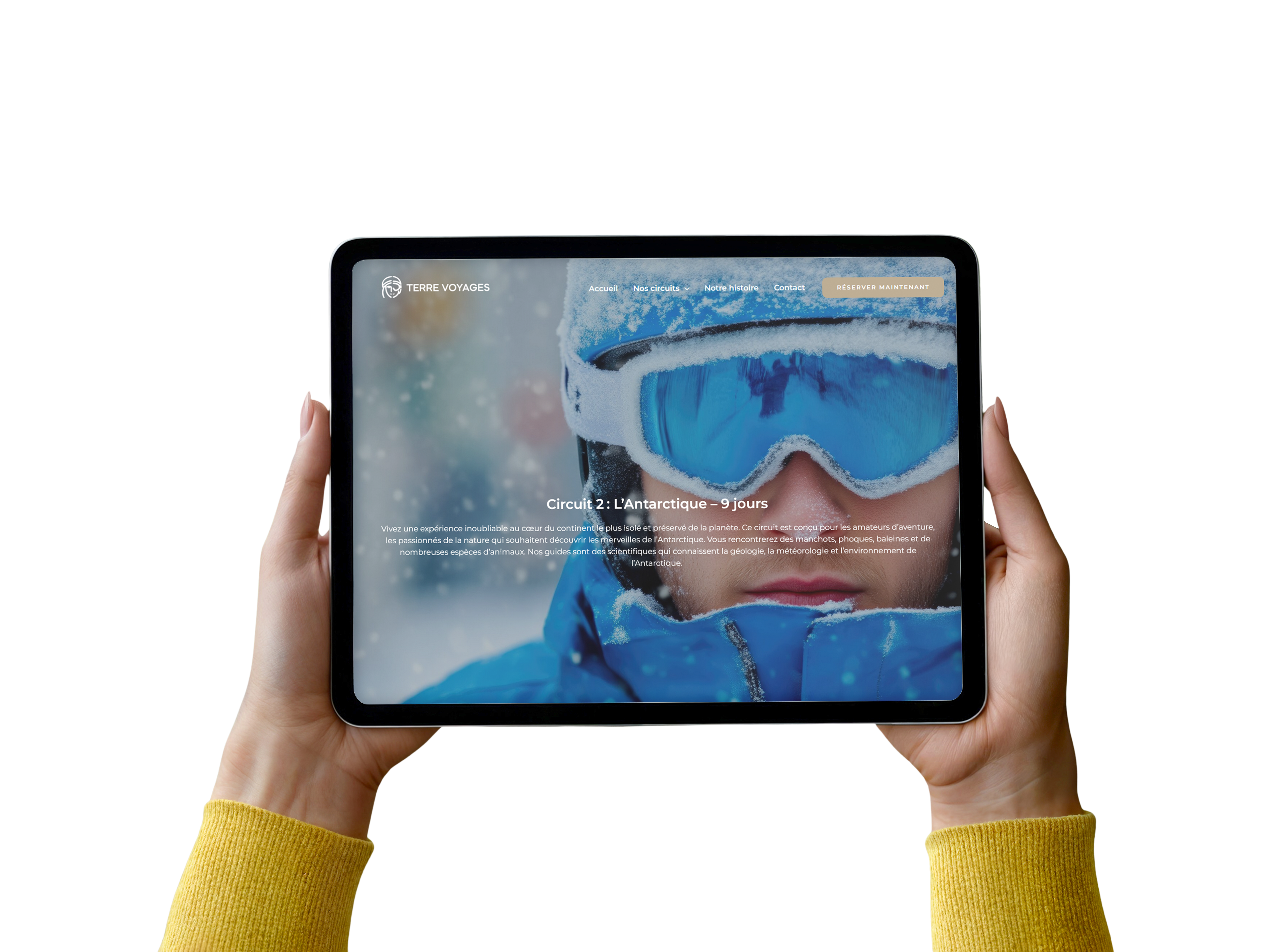 Le projet Terre-Voyages s’inscrit dans une démarche de redéfinition complète de l’image d’une agence de voyages. L’objectif était de valoriser son positionnement unique autour de séjours sur mesure, entre désert du Sahara et immensité de l’Antarctique.